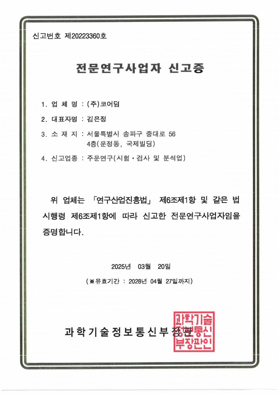 (주)코어덤 피부임상시험기관은 화장품, 생활용품, 의약외품, 건강기능식품 및 뷰티디바이스 관련 피부임상시험을 전문적으로 수행합니다.